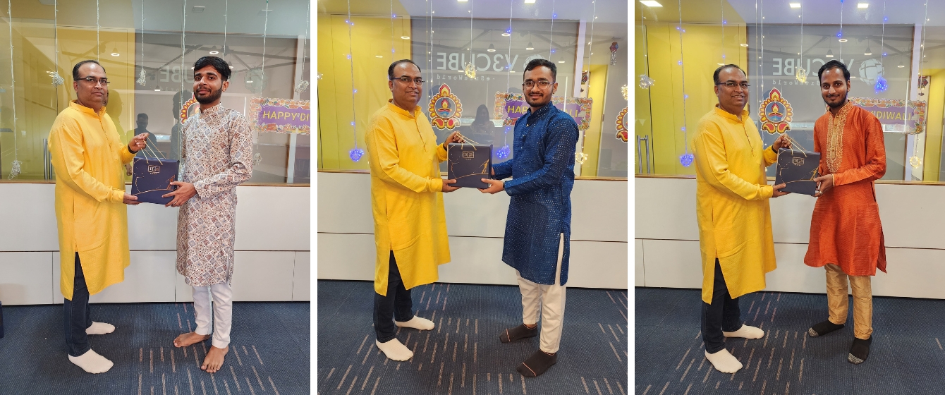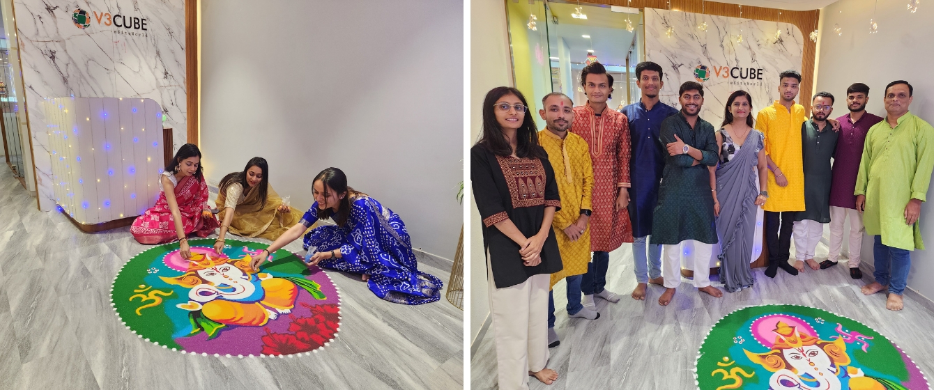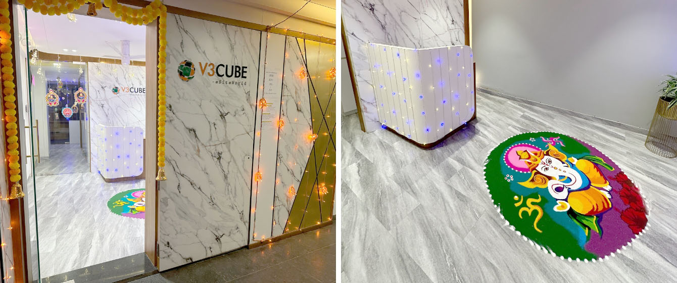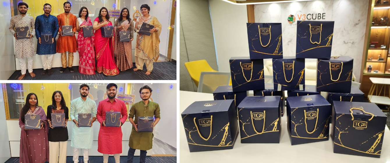 V3Cube does Everything in Style and with Great Enthusiasm! We Celebrated Our Auspicious Diwali by Decorating the Entire Head Office of V3Cube in India with Diya-shaped Fairy Lights. All the Employees of V3Cube were Glowing with Happiness, Prosperity and Dreams. And this is precisely what this Beautiful Festival of Lights is for. Diwali is an Important Festival of Our Indian Culture wherein Sweets and Gifts are offered to Loved ones. We are One Big Family and that is why We Gifted Each and Every Employee with an Exclusively crafted Gift Hamper! Did you Check-out our Artistic and Heavenly Handmade Rangoli? Yes, We All Made it together! But the Best part of the Celebrations was the set of these Fun-Loving Candid Pictures which were taken during the yummy Feast that was thrown to Us by the Senior Management Team of V3Cube. Without a Doubt, the BEST Day Ever!