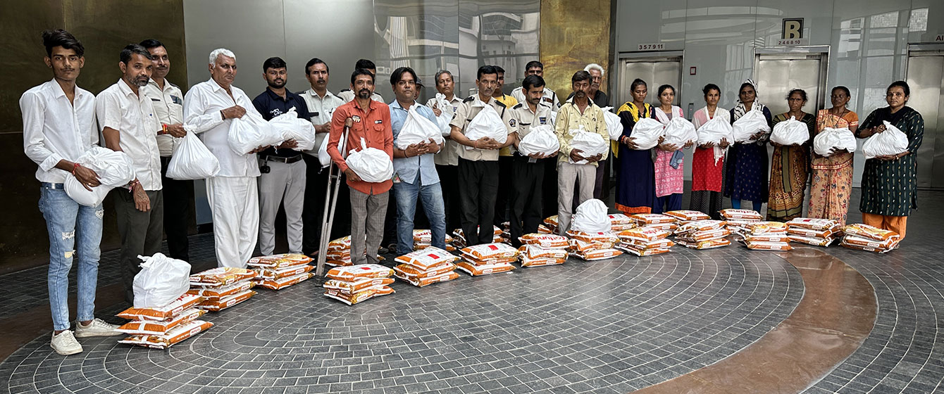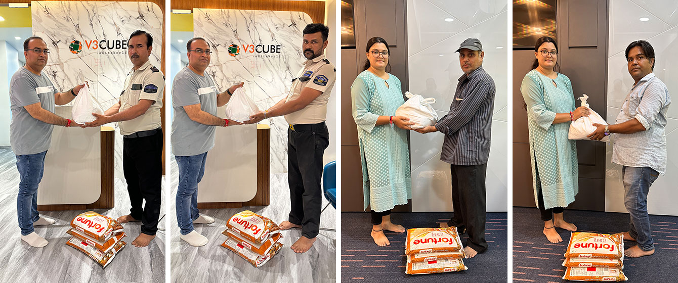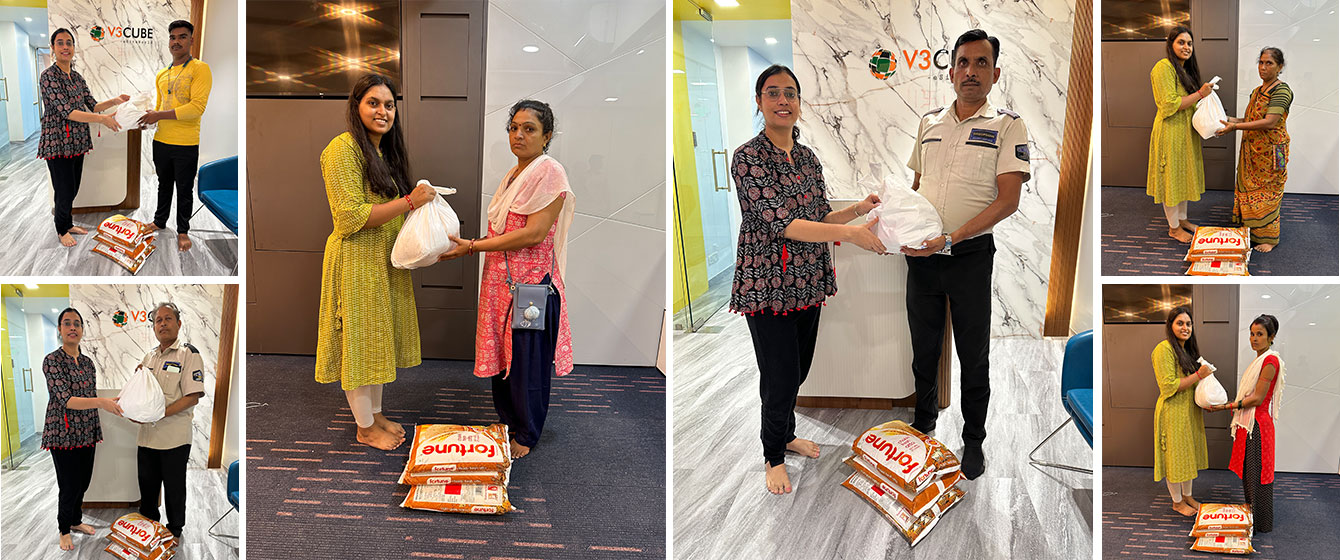 Recently, on occasion of the Festive Season, the Management of V3Cube decided to put together Grocery Bags and Food Supplies of 1 Month and distributed it amongst the staff of the Building. These people are Housekeepers, Security Guards, Physically Challenged Lift Men, Gardner, Cleaners and other premises Maintenance Personnel. The Management Team distributed these Grocery Bags and Food Supplies to show a token of respect and wellbeing to their families as well as to convey a sense of gratitude that often goes unnoticed.