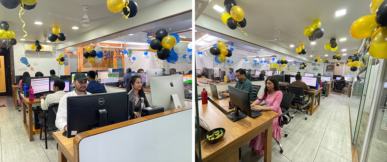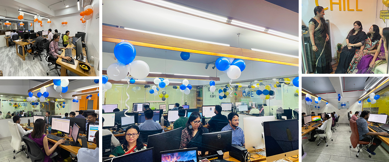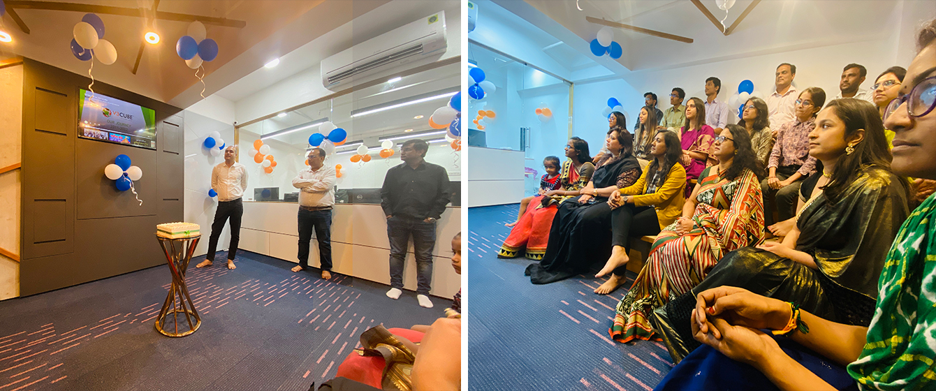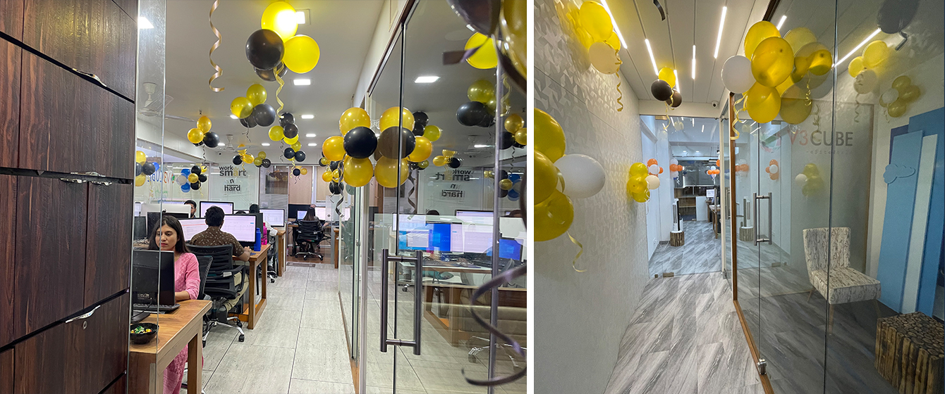 Our Corporate Office was decked out in vibrant balloons to mark the event, where Female employees flocked there wearing stunning sarees, while Men dressed in Formals. A spectacular event including a video depicting V3Cube's journey was held by the corporation in the evening. Our CEO detailed Achievements and Important Announcements and recognized and appreciated all members who had contributed to V3Cube's achievement of this remarkable milestone.