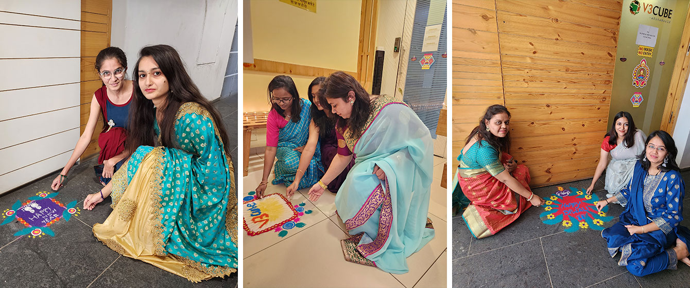 The atmosphere at work was festive, brimming with the Diwali Vibe, such an energetic and colorful Diwali Celebration as numerous electric Diyas were adorning the entire office premise, and the office ladies decorated it with colorful Rangolis. It was heartening to see so many smiling faces, many old and many new. This also was an occasion when some of the V3Cubians joined us recently. It was so wonderful to meet and greet them in person.