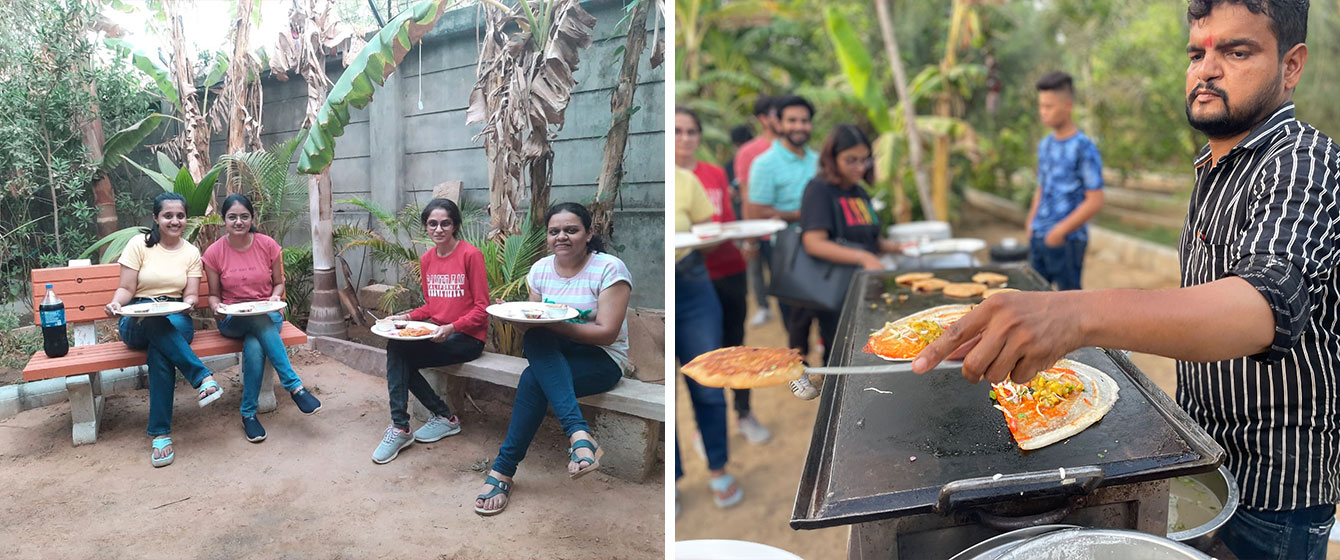 In These Photographs, you’d Find Only Two Kind of V3Cubians - One who is Smiling and having a Great Time and the Rest are just Stuffing their Mouths with Slices of 7 Cheese Pizza, Peri Peri Spicy Paneer Pizza, and Tandoori Paneer Pizza with Alfredo Pasta. This was Special for Each One of Us! Yes! These Aren’t just Candid Photographs of V3Cubians but Every Shot has Captured their Emotions as Well!Celebrating South Indian Culture At the Office Farm! - May 2022