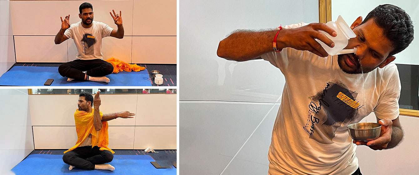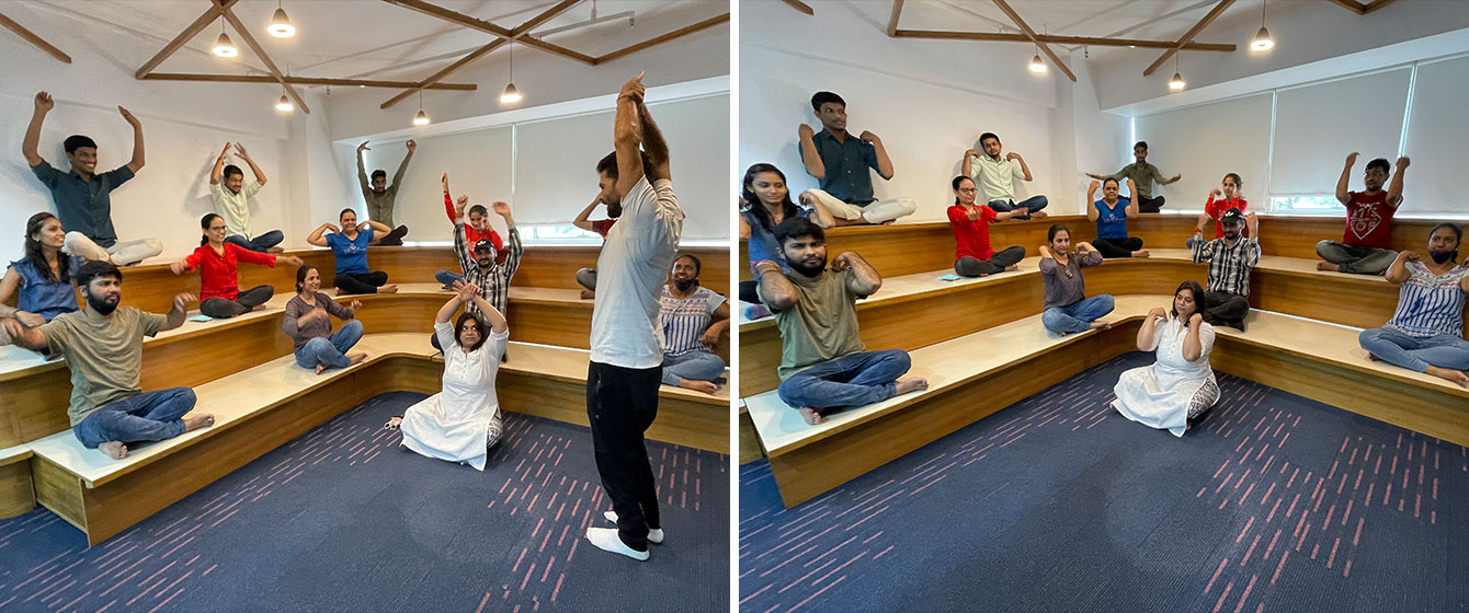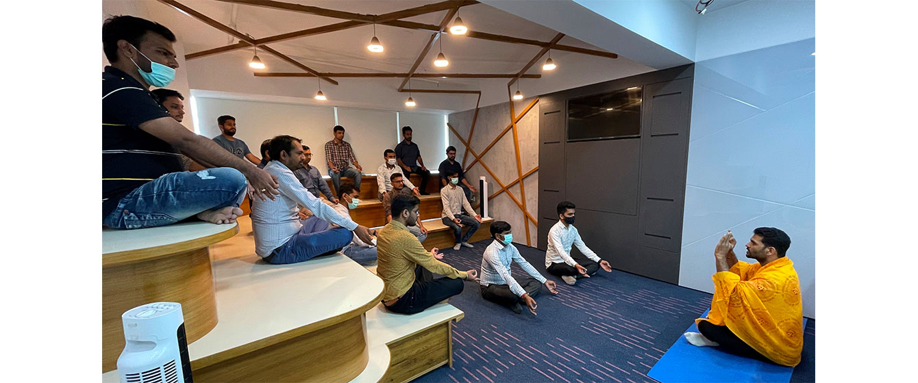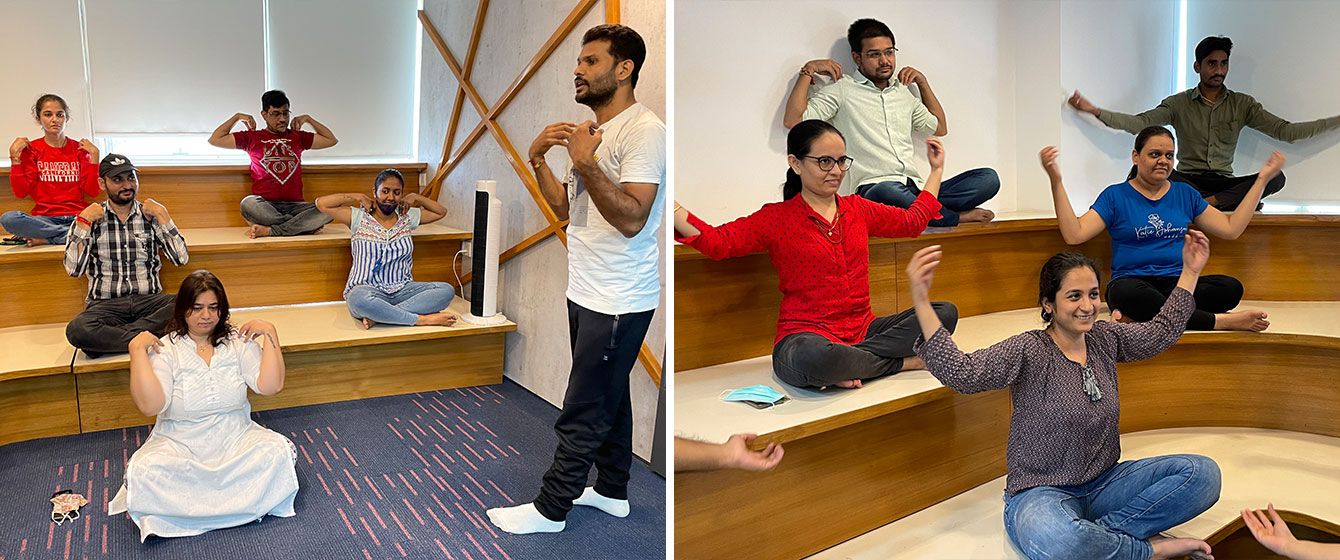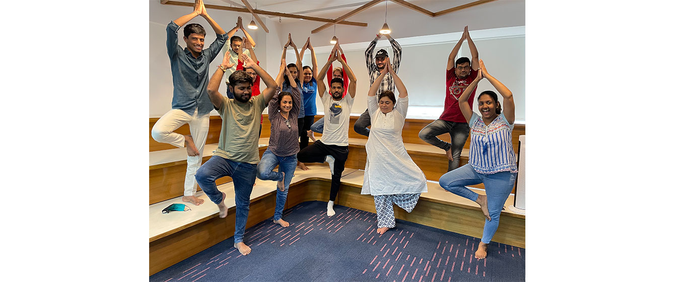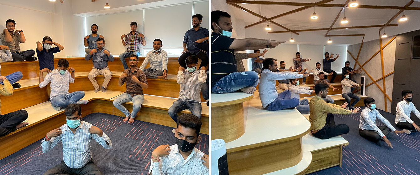 Origins of yoga can be traced back to the Ancient Indian Civilization. Yoga is practically meditation in action. V3Cube Employees meditate in “Sukhasana” while their yogi master Shri Mahesh Yogacharya is chanting “Breathe in! Breathe out!” Mahesh Yogacharya is an acclaimed yoga instructor who made headlines for tunneling out water from one nostril through the other effortlessly without choking his windpipe. It is only natural to get drained emotionally, physically in the fast-paced city life but yoga is that glass of water that quenches your thirst and rejuvenates you. V3Cube understands this and hence decided to organize this yoga session last week. Everyone seemed to have loved the one-legged prayer pose that they struck with the Yogacharya. Our team enthusiastically participated in the session and also showed their will to try difficult “asanas”. Some employees missed out of the session to get their second dose of vaccination. With such spiritual events, V3Cube tries to establish work-life balance for its employees and this of course helps break the mundane monotony.