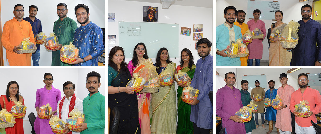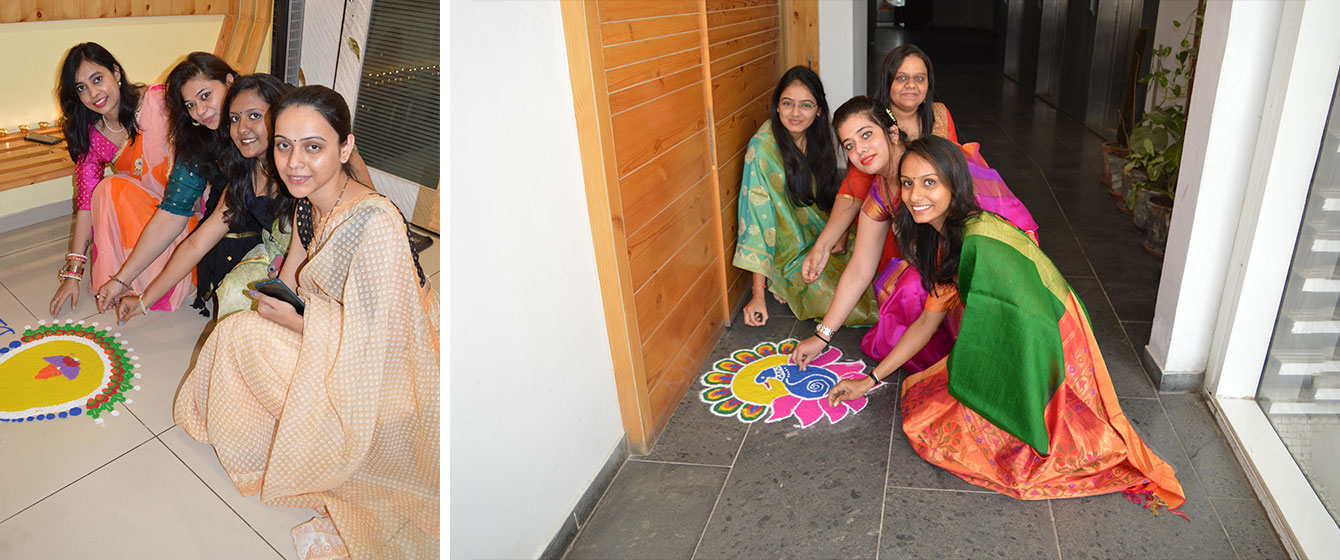 This Diwali, the sky won’t only be lit with firecrackers but also with the contagious smiles of each and every member of the V3Cube Team. The celebratory mode is on and everyone is dressed up like a doll in traditional attires to look their best for these stunning photographs! Women looked so graceful adorned in Sarees and ethnic wear while making Rangoli - It is an Indian traditional ritual to make vibrant colorful designs on the floor with colored powder. The entire office premise is embellished and beautified like a bride by countless electric Diyas and blinking Fairy Lights that too in the shape of Diyas. The most extravagant moment of the day was when every V3Cuber was gifted with massive gift baskets. Stickers of rockets, firecrackers and Sparkling Sticks have painted the whole office with a festive vibe.